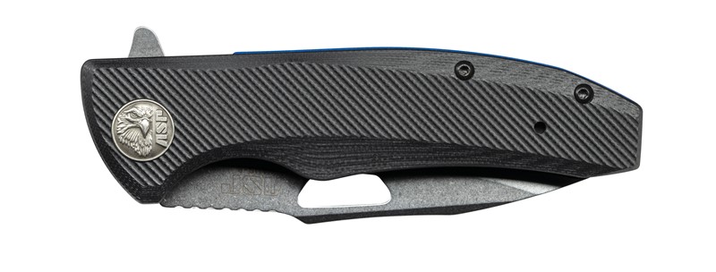 ASP Police Duty Knife (PDK) Classic Folder - Flat Grip - Stonewash. Sharp, fast and tough, the ASP Police Duty Knife (PDK) is built for the job. It's sure to become your new favorite EDC. The ASP PDK series of knives is the result of collaboration between law enforcement officers, ASP's product designers and knife engineering and manufacturing experts. Their goal was to create a practical, tough and dependable knife specifically for day-in, day-out police use. A tool of excellent quality, yet affordable for any officer. The ASP PDK features a 3.5" drop point "flipper" blade design with fast, positive assisted opening. The blade is crafted of highly corrosion-resistant, easy to maintain AUS-8 stainless steel, available in either a stonewashed or black PVD finish. A liner lock makes it safe and easy to release and close the knife. High-quality, textured G-10 scales (grip panels) provide a sure grip, and our signature Shark Fin™ jimping adds control when in use. ASP PDK knives feature our unique, quick-release pocket clip system. Reversing the clip for right- or left-pocket carry is as fast and simple as using the double lock pin on a handcuff key (not included) to release the clip lock, and snapping it into the slot on the other side. No tiny screws to use (or lose). Finishing touches include a Thin Blue Line tribute spacer in the spine of the knife, and a die struck ASP Eagle medallion mounted in the grip. ASP Police Duty Knife (PDK) Classic Folder Features: