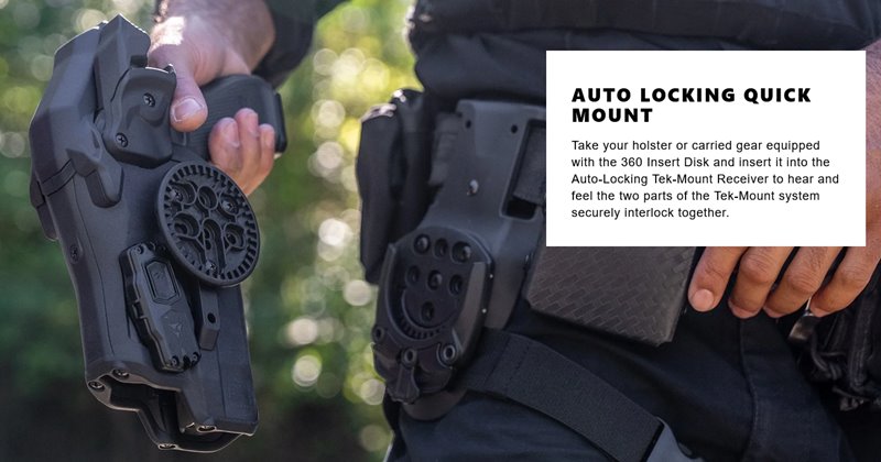 Mounting Options - The Tek-Mount Receiver can be mounted to various belts, vests, plate carriers, bags, packs, desks, dashboards, walls, gun safes, and more
