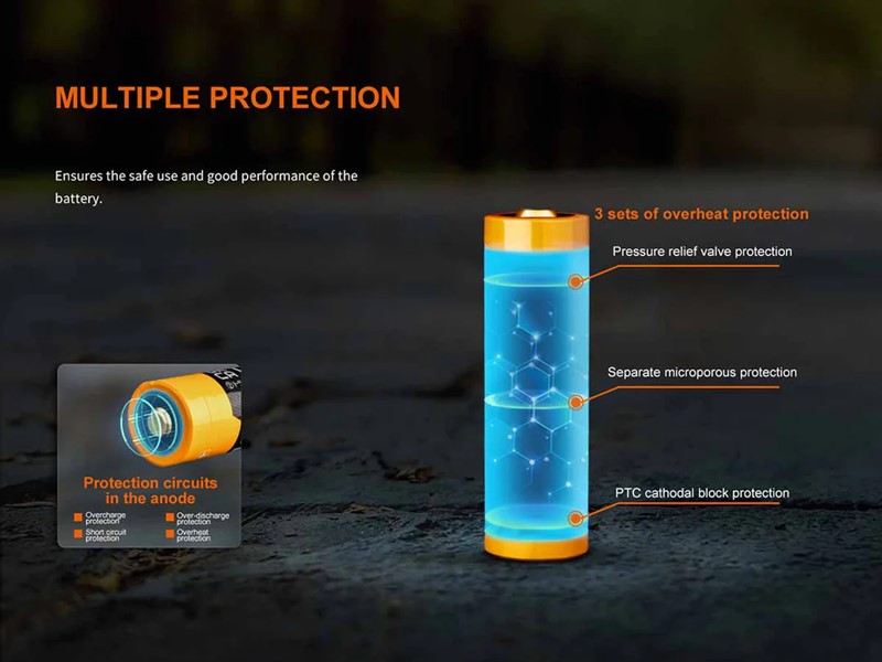 Fenix ARB-L21-6000 21700 Rechargeable Battery. The Fenix ARB-L21-6000 is a high-capacity 21700 Li-ion rechargeable battery engineered to deliver exceptional power and extended runtimes for your devices. With a massive 6000mAh capacity and a 10A maximum output, this battery ensures your gear stays powered up for longer, even under demanding conditions. Built-in protection circuitry prevents short circuits, overcharging, and overheating, while pressure relief vents ensure added safety. Even after 500 charge cycles, this robust battery maintains 75% of its original capacity, guaranteeing reliable power for years to come. Fenix ARB-L21-6000 21700 Rechargeable Battery Specs: