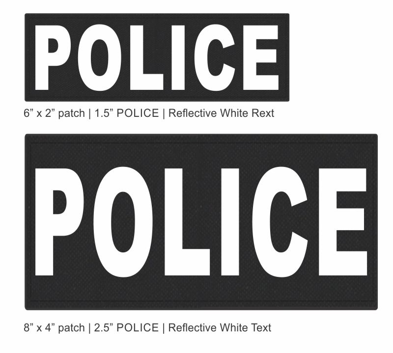 POLICE ID Patch Set - Reflective White on Black - Limited Edition. Special production run of POLICE ID set. These are standard 6x2 and 8x4 POLICE placards with reflective text on black backing with hook fabric. This was part of ober-production run. Limited quantities are available and once they are gone, they're gone.