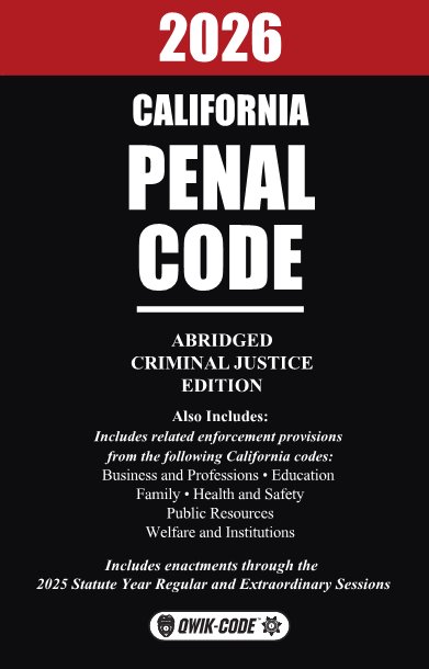 ![]() Qwik-Code 2026 California Penal Code Book - Abridged. The Qwik-Code 2026 California Penal Code Abridged book is an essential resource for law enforcement officers, legal professionals and students engaged in the criminal justice system in California. This abridged edition is particularly beneficial for individuals who require a practical, accessible version of the Penal Code without the extensive detail found in the unabridged version. Qwik-Code 2026 California Penal Code Book - Abridged Features: