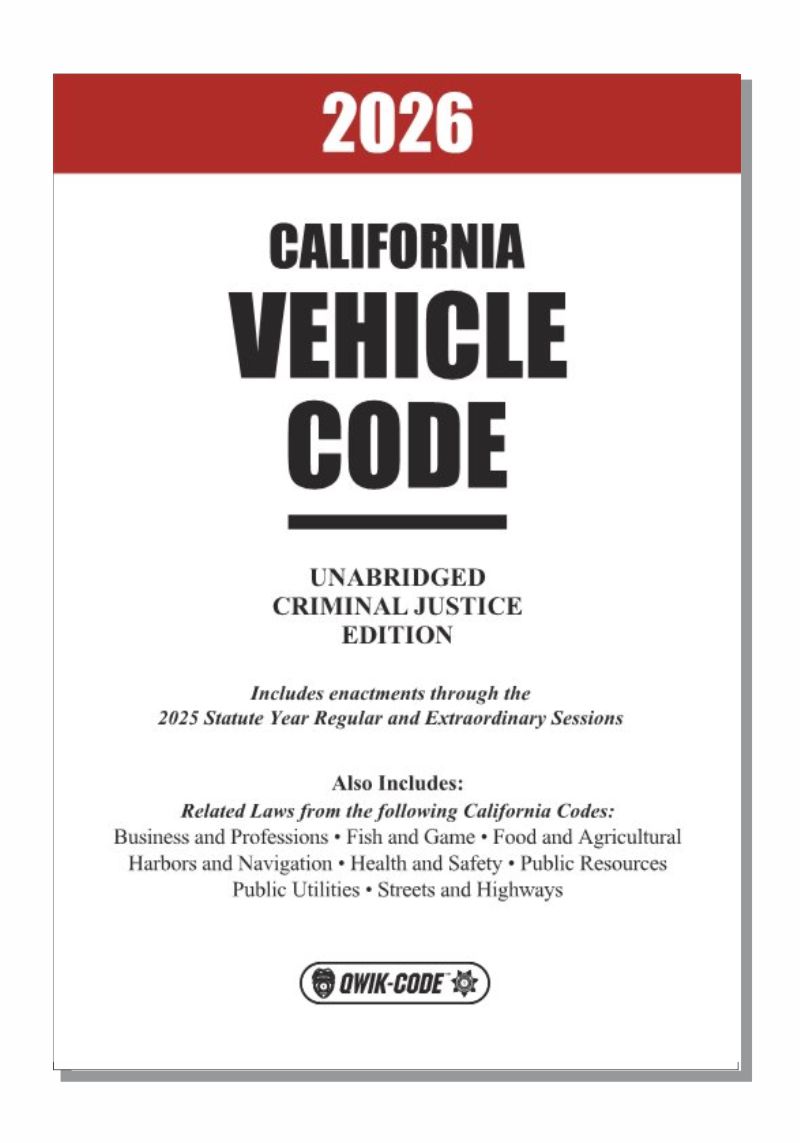 ![]() Qwik-Code 2026 California Vehicle Code Book - Unabridged. The Qwik-Code 2026 California Vehicle Code Unabridged book is a comprehensive legal reference encompassing the full text of California's Vehicle Code, along with selected enforcement sections from related statutes. This edition is essential for law enforcement officers, legal professionals, and individuals seeking an in-depth understanding of California's vehicle regulations. The Qwik-Code 2026 California Vehicle Code Unabridged book is unique as it also includes related laws from the following codes: Business and Professions, Fish and Game, Food and Agriculture, Harbors and Navigation, Health and Safety, Public Resources, Streets and Highways. Qwik-Code 2026 California Vehicle Code - Unabridged Key Features: