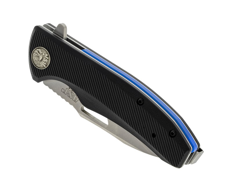ASP Police Duty Knife (PDK) Classic Folder - Flat Grip - Stonewash. Sharp, fast and tough, the ASP Police Duty Knife (PDK) is built for the job. It's sure to become your new favorite EDC. The ASP PDK series of knives is the result of collaboration between law enforcement officers, ASP's product designers and knife engineering and manufacturing experts. Their goal was to create a practical, tough and dependable knife specifically for day-in, day-out police use. A tool of excellent quality, yet affordable for any officer. The ASP PDK features a 3.5" drop point "flipper" blade design with fast, positive assisted opening. The blade is crafted of highly corrosion-resistant, easy to maintain AUS-8 stainless steel, available in either a stonewashed or black PVD finish. A liner lock makes it safe and easy to release and close the knife. High-quality, textured G-10 scales (grip panels) provide a sure grip, and our signature Shark Fin™ jimping adds control when in use. ASP PDK knives feature our unique, quick-release pocket clip system. Reversing the clip for right- or left-pocket carry is as fast and simple as using the double lock pin on a handcuff key (not included) to release the clip lock, and snapping it into the slot on the other side. No tiny screws to use (or lose). Finishing touches include a Thin Blue Line tribute spacer in the spine of the knife, and a die struck ASP Eagle medallion mounted in the grip. ASP Police Duty Knife (PDK) Classic Folder Features: