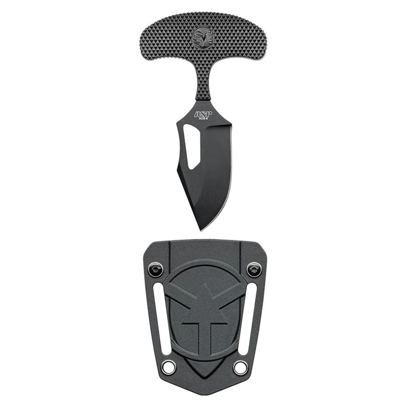 ASP Police Duty Knife (PDK) Push Knife G - Gripped. While it may have a variety of useful applications, the ASP Push Knife is first and foremost designed to be a last-resort defensive tool, primarily in a firearm retention scenario. This discreet knife is typically carried on the officer's support side and brought to bear with the non-dominant hand, leaving the officer's strong/weapon hand free to control his or her handgun. The ASP Push Knife features a 2.25", single-edge blade with their signature Shark Fin™ spine contour. Unlike typical double-edged knives of this type, this design allows the knife to be used safely for utility cutting in addition to puncturing. So, in addition to its primary defensive purpose, the ASP PDK Push Knife can be used for cutting seatbelts, opening boxes or other containers, and similar tasks. The blade is machined from AUS-8 steel, which takes and holds an edge with great durability, and is easy to maintain. Its black PVD finish is non-reflective, so it won't call attention to itself on the duty belt or vest. The knife's T-handle design assures positive retention and control, with gross motor skill simplicity. The underside of the handle features a grooved surface on one of the "wings." This tactile reminder identifies the spine side of the knife - so when the grooved side is up, the blade is facing down. Finally, each ASP PDK Push Knife includes a premium quality, custom polymer sheath with molded-in retention. The sheath includes a removable, heavy-duty spring steel clip that fastens securely to belts or web gear up to 2" wide. The 1.25" slots are provided for directly threading thinner belts or webbing, while four grommeted holes allow carrying on a lanyard or ball chain (not included), or lacing to duty gear. There are two available versions of this knife: The "G" variant features a textured polymer overmolding, completely encapsulating the handle for added grip. The "S" variant is skeletonized, keeping bulk and weight to an absolute minimum. IMPORTANT: Use of a knife as a defensive weapon constitutes lethal defense. Officers must be properly trained, and must know and adhere to their agencies' policies regarding the carrying or use of edged weapons. ASP Police Duty Knife (PDK) Push Knife G - Gripped Features: