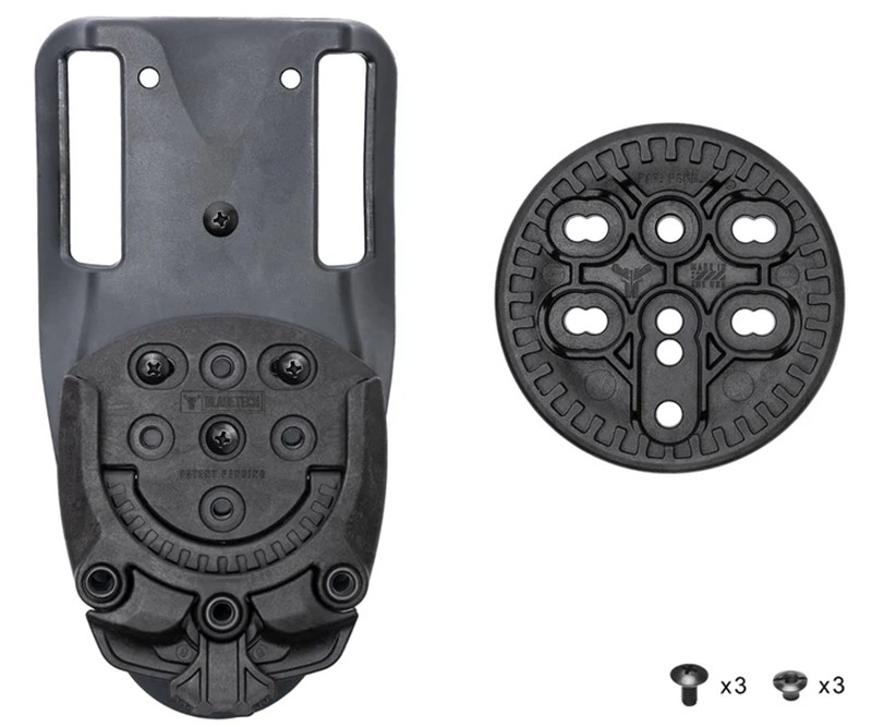 ![]() Blade-Tech Quick Connect Mounting System - Kit on Duty Drop. The Blade-Tech Tek-Mount™ Receiver is the female portion of the Tek-Mount™ system, which is a two part quick connect mounting system and requires the Tek-Mount™ 360 Insert Disk for proper use. This system provides the same function, speed, and ease of use as the Safariland® QLS but with the added ability to cant your holster instantly without the use of screws or posts. The patent pending Tek-Mount allows for 10 degree cant increments in 360 degrees. The receiver can be mounted on your existing belt attachments, MOLLE Attachments or directly to surfaces like car dashboards, bed frames, and more when choosing the "No Attachment" option. Blade-Tech Tek-Mount Quick Connect Mounting System - Kit on Duty Drop Features:
