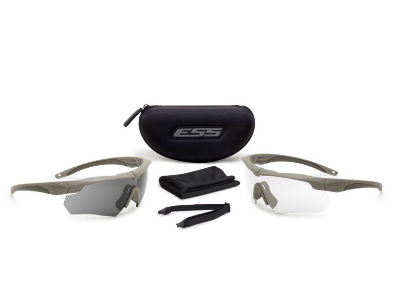 ESS Crossbow 2X Dual-Eyeshield Kit - Terrain Tan Frame. When you try on the Crossbow by ESS, you'll discover it's unlike any other ballistic eyeshield. Experience the Tri-Tech Fit frame that achieves an amazing universal fit with max comfort and zero pressure points. Then notice the lenses. They wont fog. Thats thanks to groundbreaking ClearZone FlowCoat technology, engineered to eliminate fog inside and prevent scratches outside. As you stare down your objective through distortion-free ESSOPTICS, you'll see just how optically precise vision can be. When youre ready to switch tints, the innovative DedBolt Lens Lock pivots up for easy release, then clamps down for rock solid retention under impact. It's from ESS, so of course the Crossbow is compliant with U.S. Federal OSHA, ANSI Z87.1, CE EN 166 and U.S. MIL-PRF-31013. Form, Fit, Function Perfected. Get your hands on a Crossbow and see for yourself. The Crossbow 2X version features two complete eyeshields: one eyeshield with Clear lenses and one eyeshield with Smoke Gray lenses. Crossbow 2X™ Dual-Eyeshield Key Features: