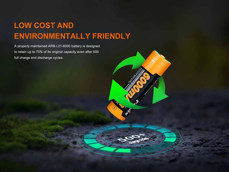 Fenix ARB-L21-6000 21700 Rechargeable Battery. The Fenix ARB-L21-6000 is a high-capacity 21700 Li-ion rechargeable battery engineered to deliver exceptional power and extended runtimes for your devices. With a massive 6000mAh capacity and a 10A maximum output, this battery ensures your gear stays powered up for longer, even under demanding conditions. Built-in protection circuitry prevents short circuits, overcharging, and overheating, while pressure relief vents ensure added safety. Even after 500 charge cycles, this robust battery maintains 75% of its original capacity, guaranteeing reliable power for years to come. Fenix ARB-L21-6000 21700 Rechargeable Battery Specs:
