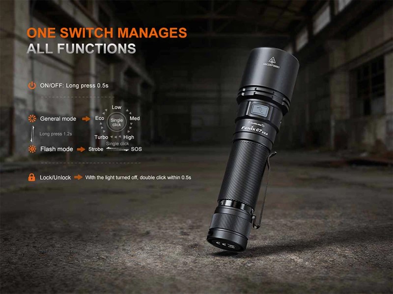 ![]() Fenix C7 V2.0 Rechargeable Flashlight - 3300 Lumens. The Fenix C7 V2.0 Rechargeable Flashlight is the ultimate high-performance tool for those who prioritize long-range visibility over compact complexity. As the dedicated "thrower" in the updated C7 series, this version pushes its maximum 3300 lumen beam to an incredible 1886ft (575m)-over a third of a mile. This flashlight provides a true spotlight experience that is perfect for search operations, large-scale industrial work, or outdoor exploration. While its sibling, the C7 PRO, focuses on maximum flood and brightness, the C7 V2.0 is engineered for precision and distance, offering professional-grade performance at an unbeatable value. Built for the rigors of professional use, the Fenix C7 V2.0 features a larger, upgraded ultra-thick A6061-T6 aluminum housing and an IP68 waterproof rating, ensuring it stands up to heavy impacts and harsh weather. Practicality is at the forefront with a magnetic tail for hands-free lighting and an inner-waterproof USB Type-C charging port that keeps the internal components protected even if the cover is left open. With seven lighting modes, including Strobe and SOS, and a specialized Lockout mode, the Fenix C7 V2.0 is a rugged, essential-only workhorse-a straightforward, high-output tool built for those who value raw performance over unnecessary frills. Fenix C7 V2.0 Flashlight Features: