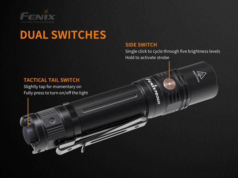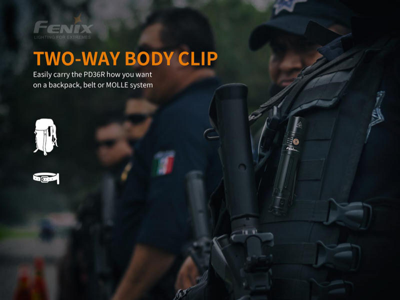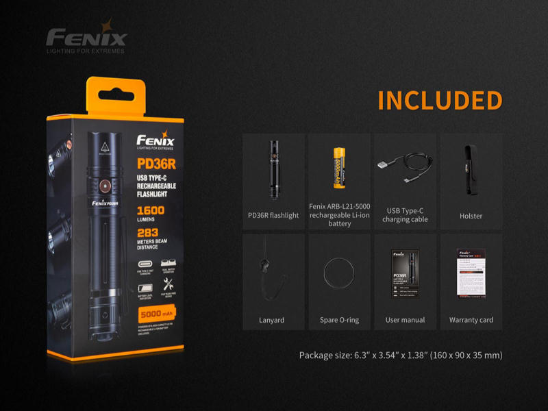 ![]() Fenix PD36R V2 Flashlight - 1700 Lumens. The Fenix PD36R V2 rechargeable flashlight is a high-performance flashlight unlike anything else on the market for its size. This LED rechargeable flashlight delivers a maximum 1700 lumens to an impressive distance of 928ft (283m), all on a high capacity 21700 li-ion battery. The PD36R is Fenix's first introduction of a product with a 21700 li-ion battery, extending battery runtimes by twice the standard li-ion battery. The high-capacity 5000 mAh battery can be conveniently charged through the USB-C port on the flashlight. Additionally, you will always be able to see the battery's charge status at a glance with the external battery level indicator. Operating this powerful LED rechargeable flashlight is simple with the tactical tail switch for momentary on/off, and the ability to cycle through six lighting modes using the side switch including a 1600 lumen turbo mode. Carry the PD36R how you want'on a backpack, belt, or MOLLE system with the two-way body clip. The amount of power and runtime packed into this flashlight are unmatched for its handheld size. IP68 rated dustproof and waterproof, this flashlight is the perfect all-purpose lighting tool for those needing maximum brightness and long runtimes. Fenix PD36R V2 Flashlight Features: