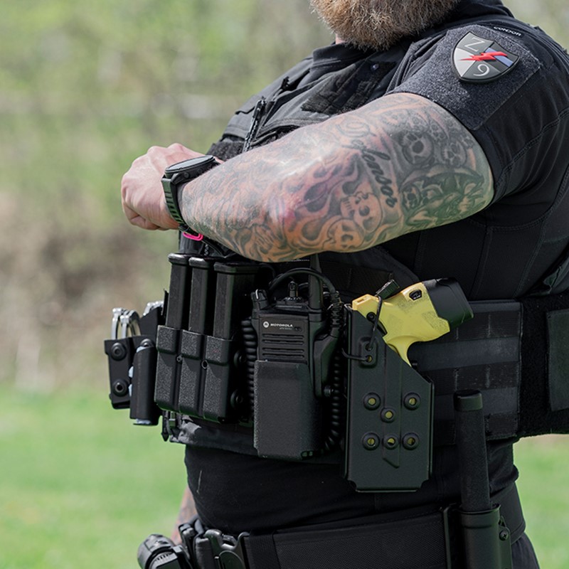 ![]() Zero9 Duty TASER 7 EDW Case. The Zero9 TASER Case is a ruggedized upgrade for your TASER® Brand TASER 7 energy weapons. These cases are ambidextrous and available with 2 Molle-Loks or a Tek-Lok attachment. The case protects the trigger and cartridge doors and is secured with a shock cord retention lanyard. The Zero9 Case for TASER® 7 Brand energy weapons can be mounted vertically or horizontally on a Molle Vest or vertically, horizontally or at a 45 degree angle on a duty belt. You can mount other cases to the front of these! If you want your OC can on the front to save space on your belt or vest you can do that. All of Zero9's duty gear share a hole pattern so you can mount other cases to the ZERO9 Case for the TASER® brand energy weapons. Zero9 TASER 7 EDW Case Features: